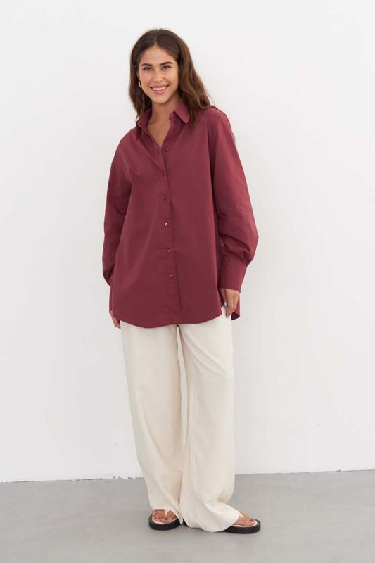 High-quality women's shirt made of free-cut cotton, burgundy color, with a yoke on the back, and slits on the sides. The shirt is suitable for both office and casual looks. The shirt can be worn as a blouse, or it can be worn as a second layer over a T-shirt or top. Made in Russia at our own production.