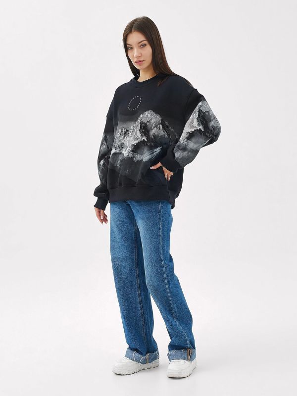 jumper is made of knitted fabric footer. Oversized silhouette jumper. The neck is rounded in shape, treated with ribana facing. The seam of the stitching of the lining along the neck of the back is closed with a ribbon xb. The sleeves are sewn in long with cut-off cuffs made of ribana. The shoulder line is lowered, the armhole is deepened. Shoulder seams are shifted towards the front. At the bottom of the jumper is a cut-off belt made of ribana.