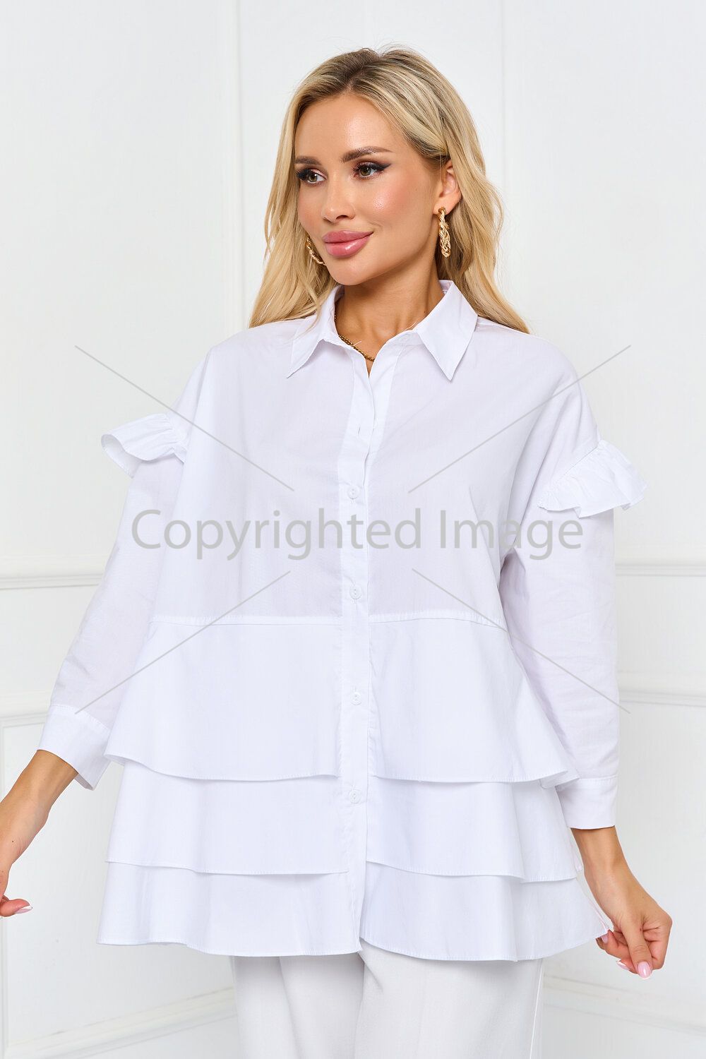 Airy as a summer breeze! Nevayo-blouse-shirt with a loose fit made of cotton fabric. Front placket with functional buttons, it can be worn either buttoned up or with the top button undone, creating a stylish V-neck. A loose fit will emphasize femininity and lightness, and a dropped sleeve with an elegant flounce will add romance and charm. Flounces at the bottom of the front create an elegant accent and give the image a special lightness. With jeans, a skirt, shorts, trousers – in this blouse you will look perfect!